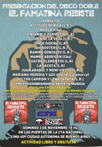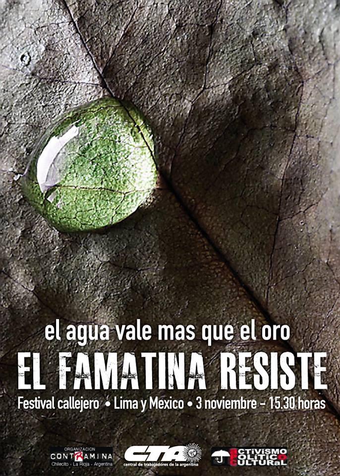 afiche famatina resiste de walter piedras IEl próximo domingo 3 de noviembre a partir de las 15 horas se llevará a cabo en la puerta de la CTA Nacional -Lima 609- la presentación del disco doble “El Famatina Resiste”, en un jornada de activismo político cultural a metros del Obelisco. “Lucha por medio del arte, por una consulta popular para recuperar la soberanía del pueblo, pueblo que lucha y que quiere decidir su futuro”, anuncian los organizadores.