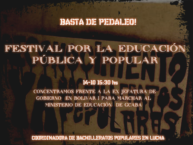 Este miércoles 14 de octubre a partir a las 15.30 horas el Frente de Bachilleratos Populares de la CTA junto a la Coordinadora de Bachilleratos Populares en Lucha se concentrarán en las puertas de la ex Jefatura de Gobierno de la Ciudad de Buenos Aires para movilizar desde ahí hasta el Ministerio de Educación porteño, donde se llevará a cabo un Festival, bajo la consigna de “Basta de pedaleo”.