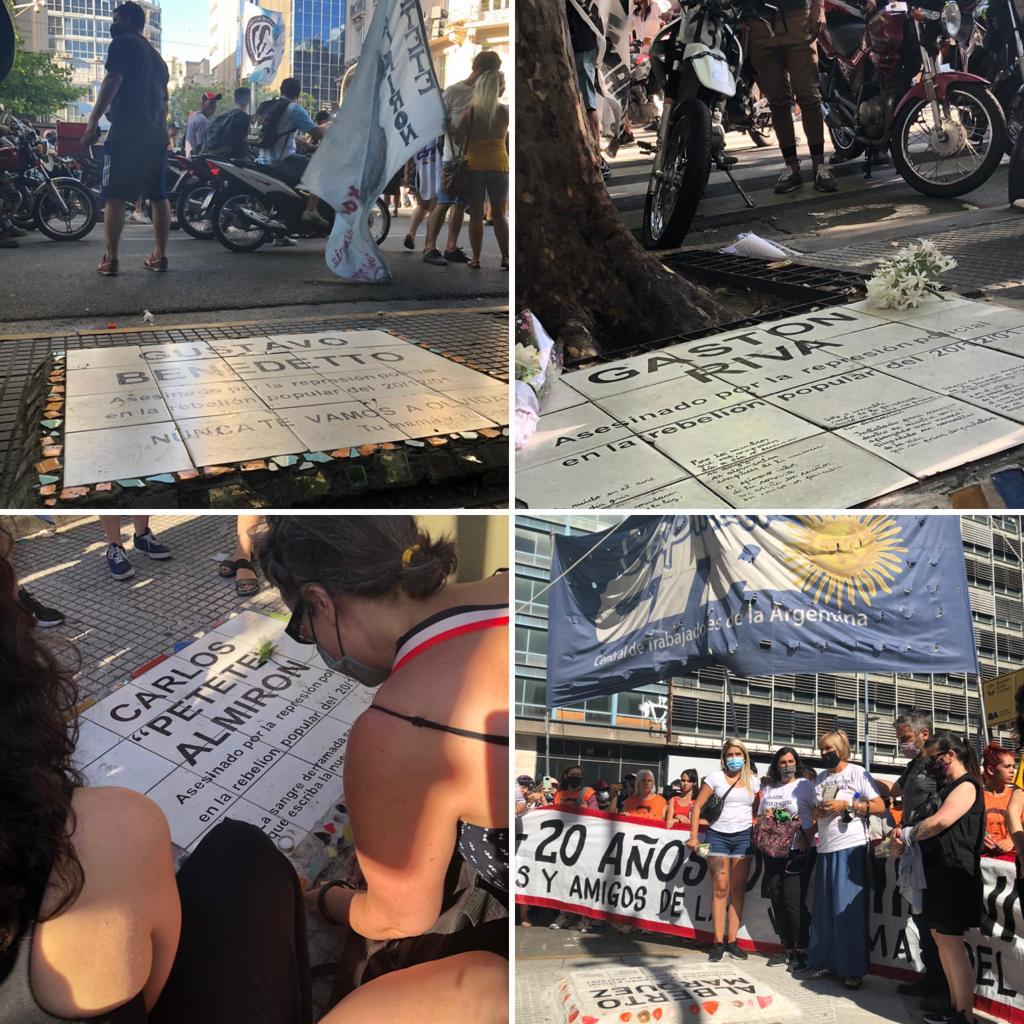 El homenaje a las y los compañeros asesinados el 19 y 20 comenzó a las 16 horas en la esquina de Sarmiento y Carlos Pellegrini, donde se encuentra la placa de Alberto Márquez; y luego continuó por cada uno de los sitios que conmemoran a los asesinados: Hipólito Yrigoyen y Avenida 9 de Julio, donde están las de Diego Lamagna y Carlos Almirón; Tacuarí y Avenida de Mayo, donde se encuentra la de Gastón Riva; y Chacabuco y Avenida de Mayo, donde se recuerda a Gustavo Benedetto.