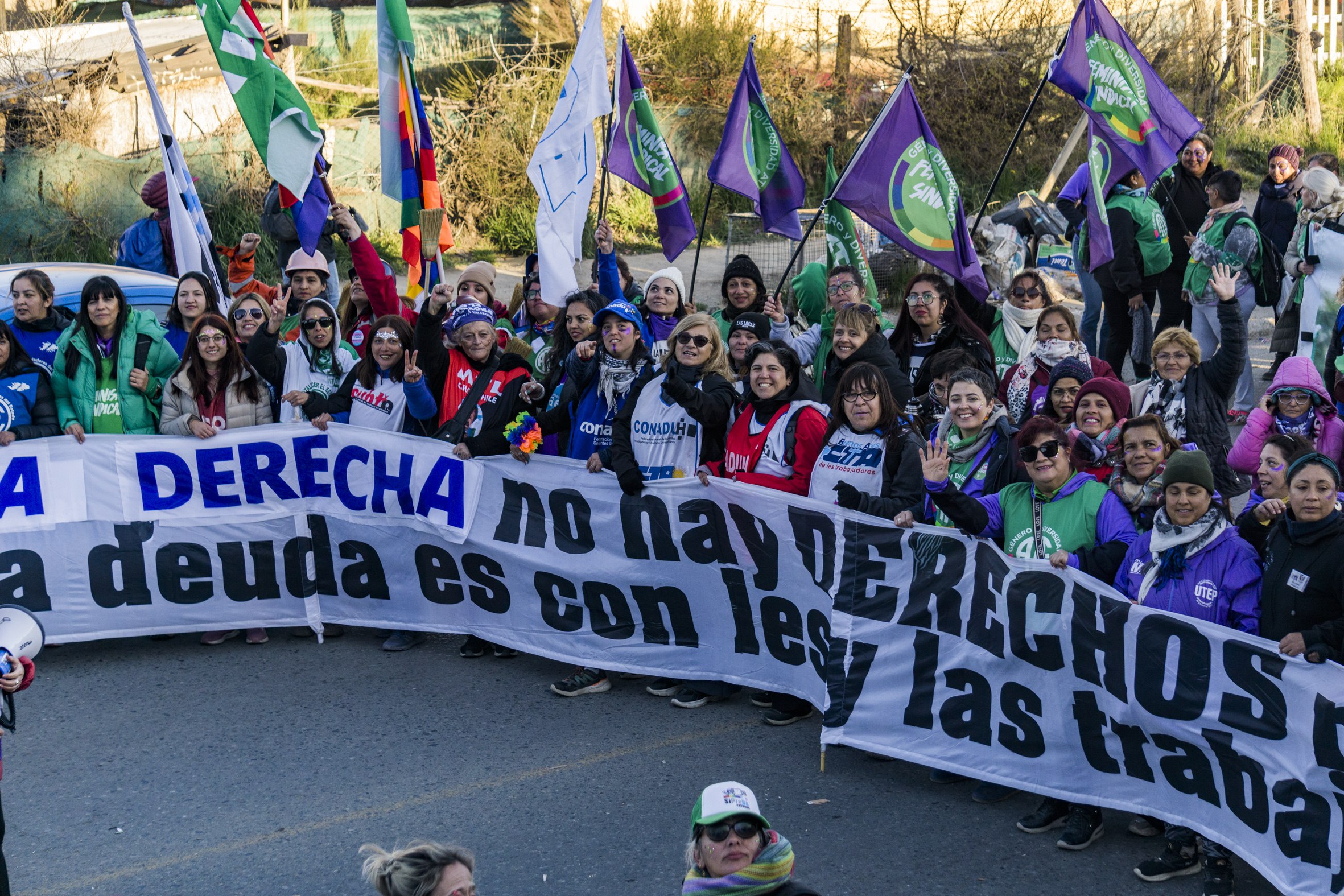 A orillas del lago Nahuel Huapi, el sábado 14 el Frente intersindical feminista compuesto por las principales centrales obreras, de la economía popular y sindicatos -CTA, CTA T, UTEP, CONADU, SUBTE, ATE- leyeron un documento conjunto en repudio al avance negacionista y de la derecha y en defensa de la democracia, la salud y la educación pública.