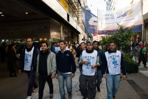 La columna de manifestantes, que incluyó también a familiares y vecinos de los despedidos, al tronar de bombos y consignas, marcharon por la Avenida Corrientes y luego tomaron por Florida. La peatonal, no acostumbrada a ser escenario de marchas, se vio sorprendida por las grandes banderas y el cantar de los manifestantes. A la cabeza estuvieron muchos de los acampantes. Una vez llegados a la puerta de Movistar, varios referentes hablaron a través de un altoparlante ante la mirada de pocos amigos de personas de seguridad apostados frente a la entrada a dichas oficinas.