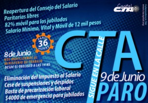 La CTA Capital convoca para este lunes 8 de junio a un abandono de tareas a partir de las 12 del mediodía, para de esta manera poder concentrar en el Obelisco a las 14 horas y marchar desde ahí hasta el Ministerio de Trabajo de la Nación, junto a los compañeros y compañeras de la CTA Provincia de Buenos Aires.