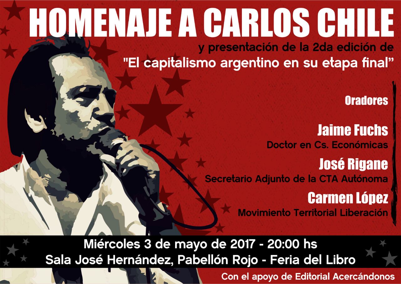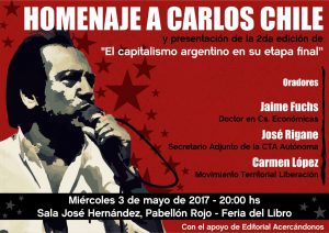 El homenaje a la trayectoria y la coherencia de vida de Carlos Chile como militante, se unirá a la presentación de la segunda edición del libro de Jaime Fuchs, “El capitalismo argentino en su etapa final”, relacionando la importancia actual de este tipo de producción y de tener presentes estos ejemplos de lucha y entrega para los desafíos actuales de nuestra clase.