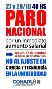 Por otra parte, en el marco del paro de 48 horas, se realizará una concentración y movilización contra el ajuste presupuestario en las universidades y en los distintos organismos públicos de Ciencia y Tecnología frente al Congreso de la Nación desde las 16.00 horas del jueves 27.