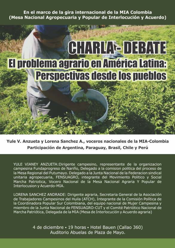Posteriormente, como parte de sus actividades pactadas, Yule Anzueta y Lorena Sánchez Andrade, voceros nacionales de la MIA Colombia, bajo el título “El problema agrario en América Latina: Perspectivas desde los Pueblos”, darán una charla-debate el miércoles 4 de diciembre, a las 19 horas, en el Auditorio Abuelas de Plaza de Mayo del Hotel BAUEN (Callao 360).