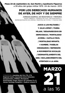 Este sábado 21 de marzo, a las 16 horas, se llevará a cabo en la Plaza 24 de septiembre (Av. San Martín y Apolinario Figueroa), en ocasión de los 39 años del Golpe Militar 1976 -24 de marzo -2015. Habrá radio abierta, bandas en vivo (Buyangueros), representantes de APEMIA, muestras de fotos y muchos más.