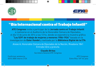 En el marco del «Día internacional contra el trabajo infantil» quienes forman parte de la Asociación de Trabajadores del Estado Congreso realizarán el acto de apertura de la muestra gráfica basada en la investigación de Ester Kandel «Ley 5291de trabajo de mujeres y niños 1906-1924».Día Internacional de las Personas con Discapacidad