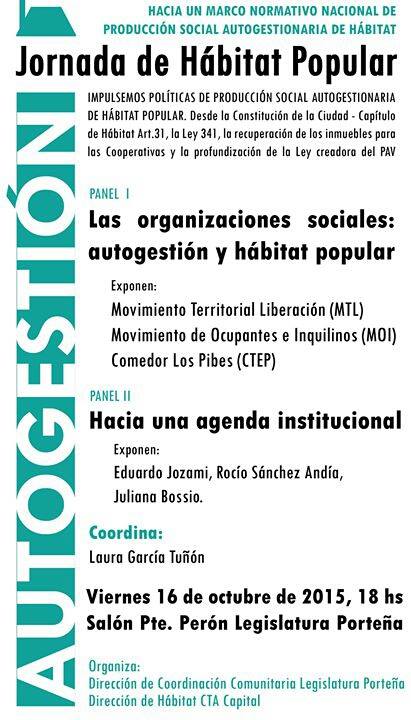 Este viernes 16 de octubre a partir de las 18 horas en el Salón Presidente Perón de la Legislatura Porteña, se llevará a cabo una Jornada de Hábitat Popular hacia un Marco Normativo Nacional de Producción Social Autogestionaria de Hábitat. Organizan esta actividad: la Dirección de Coordinación Comunitaria de la Legislatura y la Dirección de Hábitata de la CTA Capital.