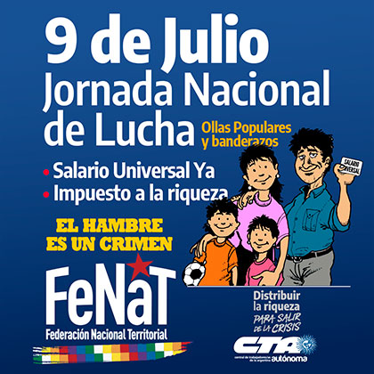 Este 9 de julio es una nuestra fecha patria y la Federación Nacional Territorial (FeNaT-CTAA) convoca a una Jornada Nacional de Lucha, con ollas populares y banderazos, para reafirmar la lucha por un país que nos incluya a todos y todas. Habrá acciones en todo el país.