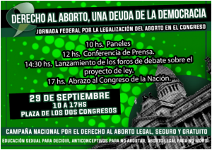 El día lunes 29 de septiembre, en el marco de las actividades del Día por el Derecho al Aborto de las Mujeres de América Latina y el Caribe (28 de septiembre), la Campaña Nacional por el Derecho al Aborto Legal, Seguro y Gratuito realizará una Jornada Federal cuyo objetivo será mostrar la necesidad de discutir el proyecto de ley para legalizar el aborto, como gran deuda de la democracia con las mujeres argentinas. En el marco del Día por el Derecho al Aborto de las Mujeres de América Latina y el Caribe, la actividad se llevará a cabo en la Plaza de los Dos Congresos, este lunes 29 de Septiembre de 10 a 17 horas.