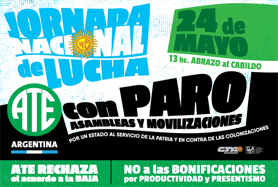 La Asociación Trabajadores del Estado (ATE-CTA) llevará a cabo este miércoles 24 de mayo una Jornada Nacional de Lucha con paro, asambleas y movilizaciones bajo el lema «Por un Estado al servicio de la Patria y en contra de las colonizaciones». A las 13.00 horas habrá un abrazo al Cabildo. ATE rechaza el acuerdo a la baja y las bonificaciones por productividad y presentismo.