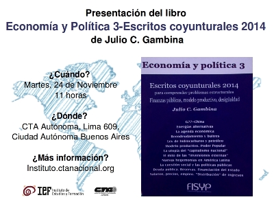 Por un lado, analizarémos y debatirémos los resultados del balotaje el 22 de noviembre. Por el otro lado, presentará su último libro el director del IEF-CTA A, Julio C. Gambina. Economía y Política 3-Escritos coyunturales 2014 es una compilación de los artículos publicados en el blog de Julio Gambina y en otros medios durante el año 2014.