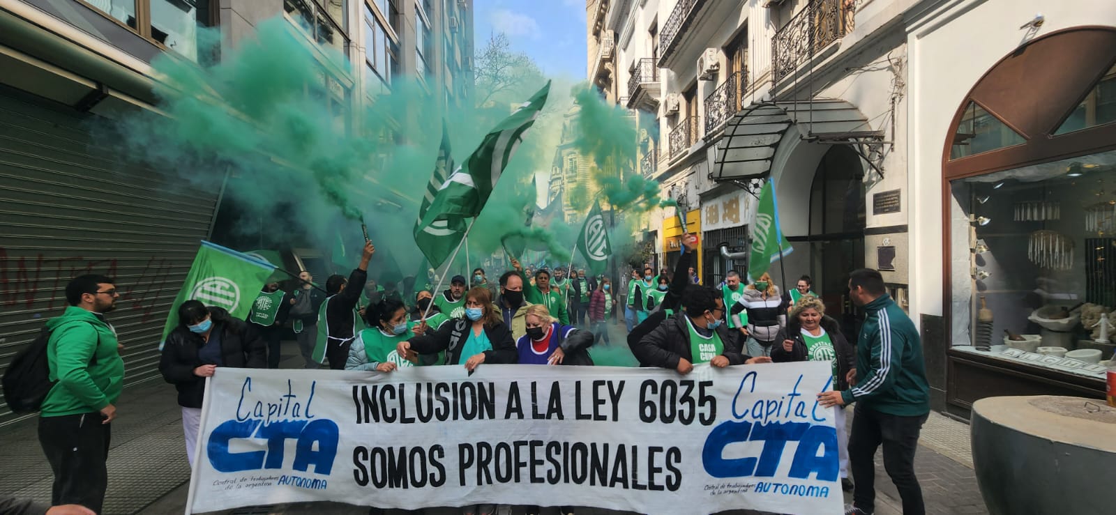 La CTAA Capital se movilizó este mediodía hacia una de las sedes del Poder Judicial de la Ciudad de Buenos Aires para exigir el reconocimiento como profesionales de las y los trabajadores de Enfermería, la inclusión a la Ley 6035 y la equiparación salarial.