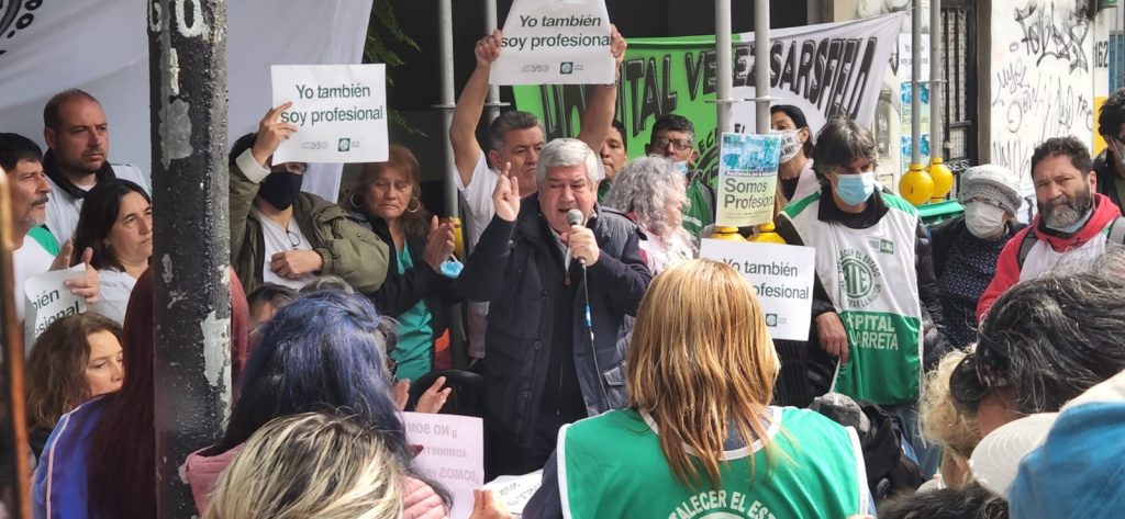 “Larreta nos vive ninguneando, no queremos carreras paralelas, queremos estar en la Ley 6035 como corresponde. Agradezco de verdad a toda la enfermería, a todos los diferentes colores, porque acá lo que nos une es la profesión. Y con el acompañamiento de todos los dirigentes hay que hacer fuerza porque Rodriguez Larreta tiene que saber que la salud está presente de la mano de las diferentes organizaciones”, expresó Héctor Ortiz, delegado General Adjunto de ATE Hospital Durand y Pedro de Elizalde, ex Casa Cuna, durante la conferencia de prensa,