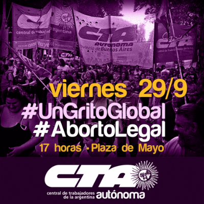La CTA Autónoma, siendo miembro de la Campaña Nacional por el Derecho Legal, Seguro y Gratuito, convoca a #UnGritoGlobal por la Despenalización y Legalización del Derecho al Aborto.
