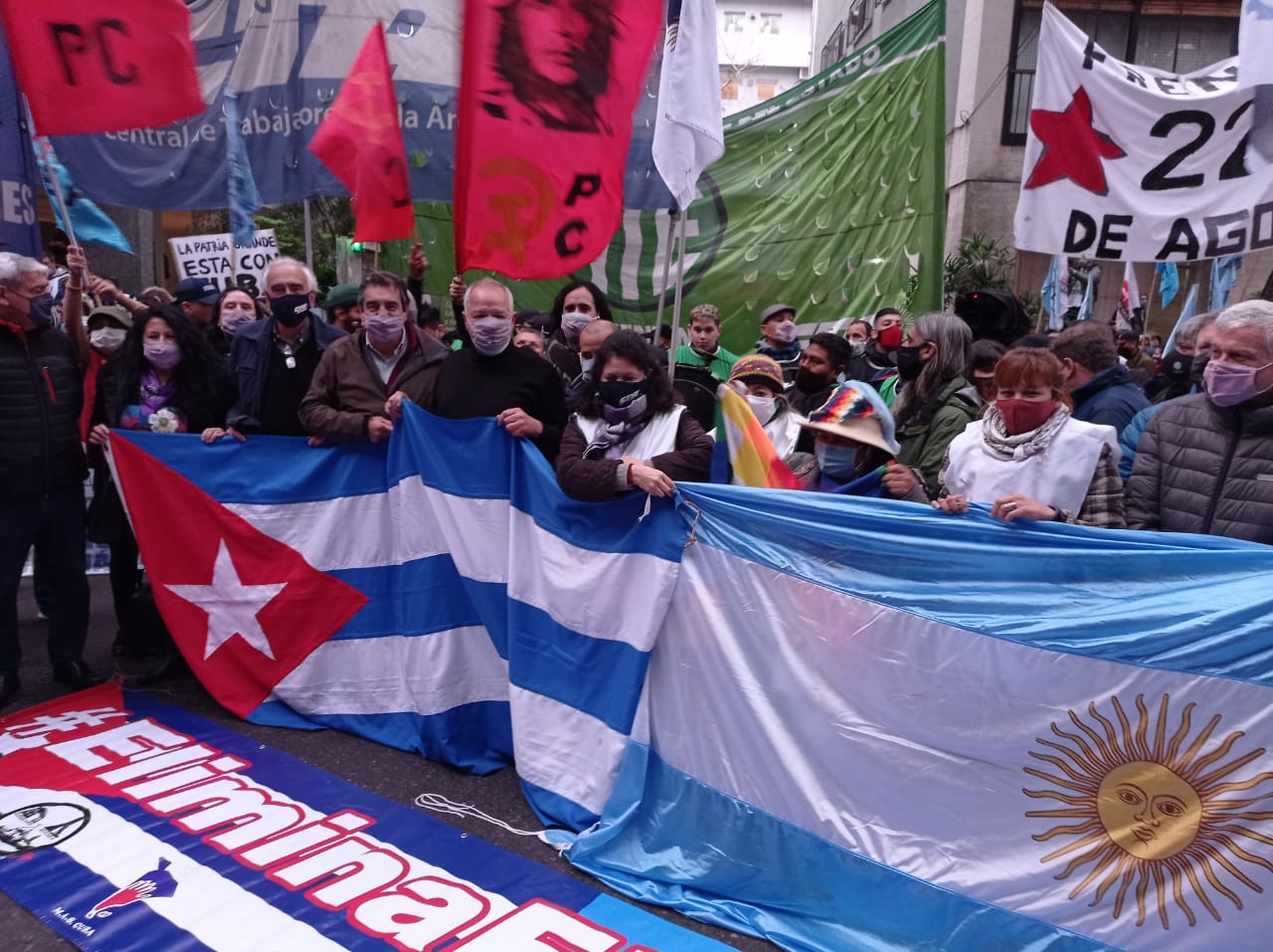 La Central protagonizó, junto a otras organizaciones sociales y sindicales, una masiva movilización frente a la sede diplomática de Cuba en Buenos Aires mientras persiste el bloqueo criminal de EE.UU contra la Isla, agravado por la pandemia, y se registra una campaña mediática difamatoria impulsada por el imperialismo.