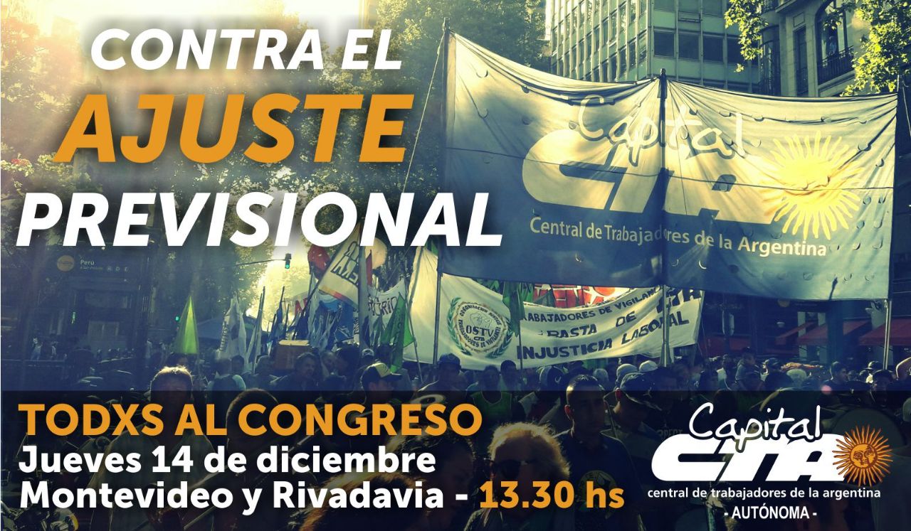 La CTA-A de Capital participa y convoca a la marcha contra el ajuste previsional. La concentración será este 14 de dicieembre a las 13.30 horas en Montevideo y y Avenida Rivadavia, para marchar desde ahí hasta el Congreso de la Nación.