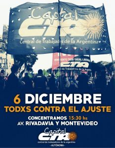 Tal como se resolvió el pasado sábado 25 de noviembre, en el último Encuentro de Militantes, la CTA Capital saldrá a la calle para manifestarse en contra del ajuste que impone el Gobierno Nacional.