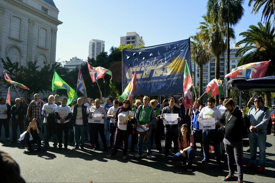 Trabajadores de la Asociación Trabajadores del Estado y de la Federación Judicial Argentina, que integran la CLATE, se reunieron frente a la sede del gobierno brasileño en Buenos Aires para acompañar a sus pares que cumplían una huelga general contra el gobierno de Michel Temer y las reformas que éste impulsa e implican una clara pérdida de derechos para los trabajadores y trabajadoras.