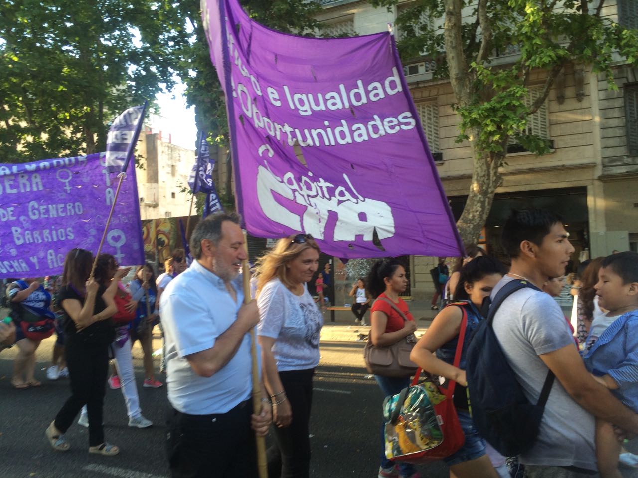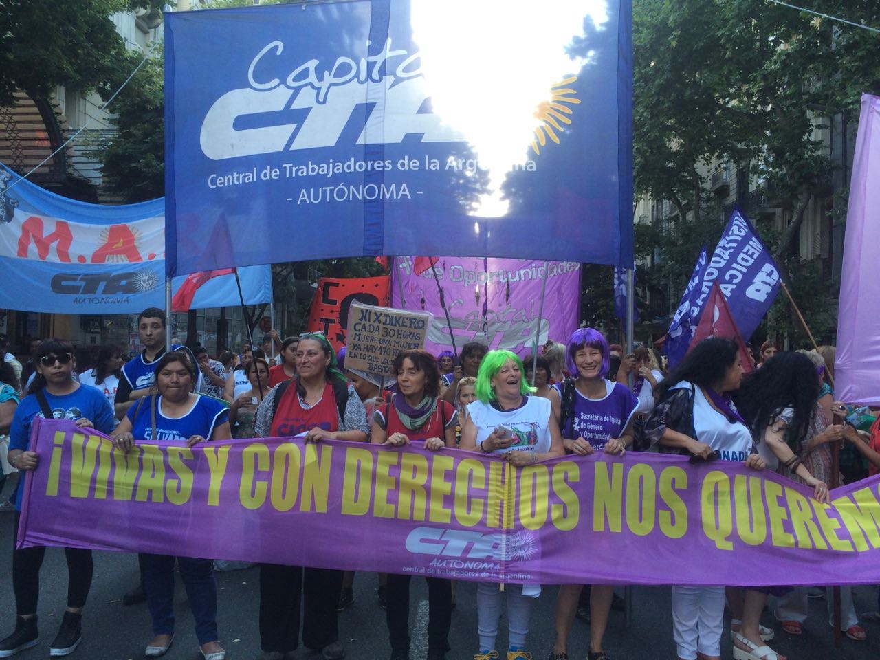 “Para nosotras,como secretaría de Género de la CTA Capital, nos parece importante estar hoy participando en esta movilización, para exigir que se termine la violencia contra las mujeres y para repetir los mismos reclamos que hace años les venimos haciendo a los distintos gobiernos: aborto legal y gratuito; que le den presupuesto real a la Ley de Violencia que se sancionó en el año 2008; pedimos que el Gobierno se haga responsable de los femicidios, necesitamos que el Estado se haga presente, porque están matando una o dos mujeres por día.”, expresó Jorgelina Sosa, secretaria de Género de la CTA Capital, en el arranque de la movilización.