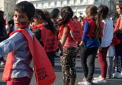 Una columna de niños y niñas con pecheras de “Che Pibe” esperaban junto a los hermanos de la Comunidad Qom La Primavera, en el acampe que llevan adelante en 9 de Julio y Avenida de Mayo desde hace dos meses, esperando a ser recibidos por la Presidenta. La movilización abrazó el acampe: “las mujeres originarias queremos construir unidad para la vida, para construir un nuevo país. Y no sería unidad si no consideramos y abrimos la lucha de nuestros hermanos de Formosa”, dijo Moira Millan.