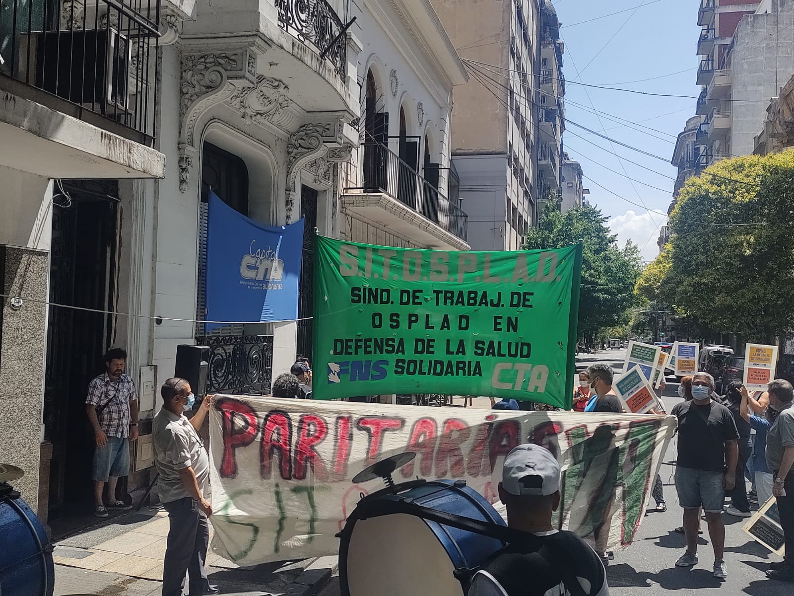 Las y los compañeros del SiTOSPLAD-CTAA hicieron una radio abierta y corte de callefrente al Policlinico del Docente, ubicado en Lavalle 1974, en reclamo de salarios acordes a la canasta básica, ya que, por ejemplo, un enfermero que ingresa no llega a ganar 40 mil pesos.