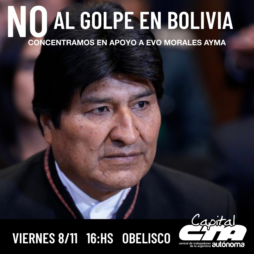 Por una patria grande justa, libre y soberana, el viernes 8 a las 16 hs la CTAA Capital se encontrará con los hermanos y hermanas bolivianas en Argentina en el Obelisco ( Avenida Corrientes y 9 de Julio), para marchar juntos hasta la embajada del Estado Plurinacional de Bolivia, en Avenida Corrientes 545.