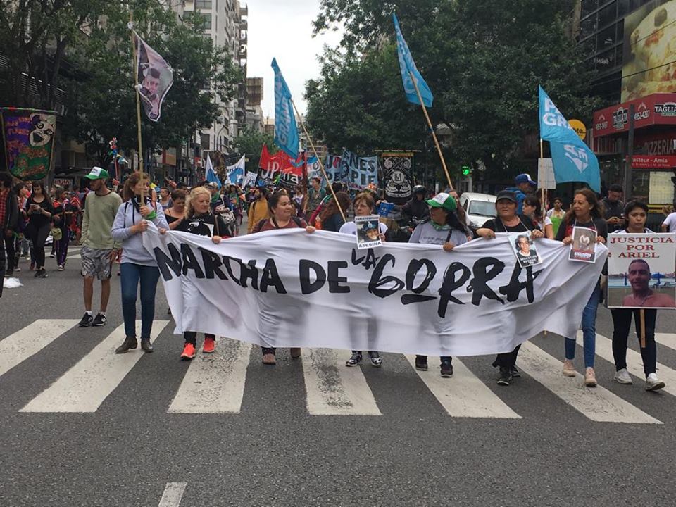 Las organizaciones que participaron de la movilización eligieron para manifestarse el Ministerio de Seguridad porque es su titular -Patricia Bullrich- quien premia a los policías que matan por la espalda y quien inauguró junto al presidente Mauricio Macri la doctrina Chocobar.