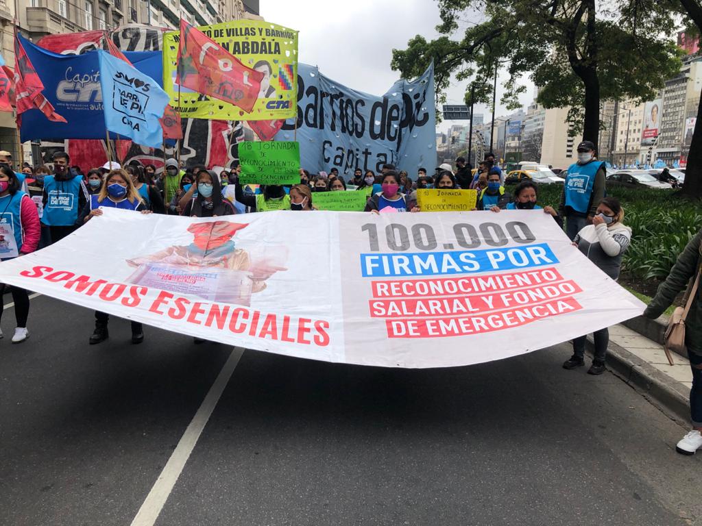 Esta vez, además se hizo una concentración en el Obelisco y se marchó en caravana desde ahí hasta la sede del Ministerio de Desarrollo Humano y Hábitat de la Ciudad, ubicado al 1600 de la calle México, para acercar los reclamos que las compañeras y compañeros de las organizaciones sociales vienen sosteniendo desde hace cuatro meses.
