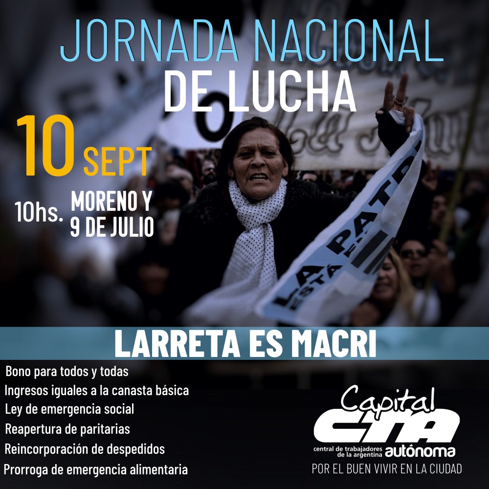 Este martes 10 de septiembre la CTAA Capital participará de la Jornada Nacional de Lucha anunciada por la Central Autónoma, para afrontar al gran ajuste que el Gobierno aplica a los distintos sectores de la sociedad. La concentración será a las 10 de la mañana en Moreno y 9 de Julio para marchar desde ahí hasta Plaza de Mayo, donde será el acto central.