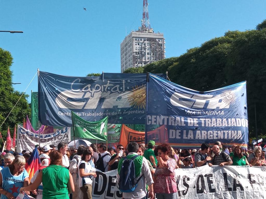 Al llegar a la 9 de Julio y entre una multitud que marchaba hacia Rivadavia y Callao, Pablo Spataro, secretario General de la CTAA Capital, expresó: “nueve de cada diez dólares otorgados por el FMI al gobierno de Macri se dieron a la fuga dejando al país en ruinas. El gobierno de Macri junto al FMI perpetraron una verdadera estafa que hay que investigar y anular de manera inmediata. La única deuda que hay que pagar es con el pueblo”.