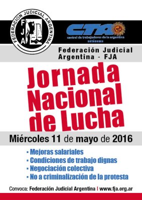 «Por tal motivo se convoca a esta Jornada nacional que se implementará a lo largo y ancho de la Argentina a través de medidas tales como paros, asambleas, volanteadas, etc., las que serán fijadas por cada sindicato», finaliza la declaración de la Federación Judicial Argentina (FJA-CTA).
