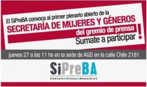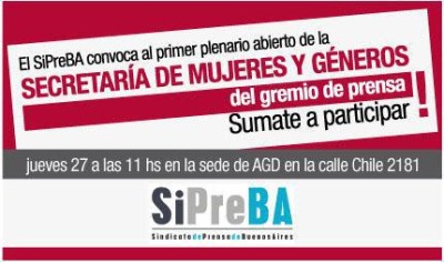 Lxs trabajadorxs de la INTERRADIAL, rama radio del Sindicato de Prensa de Buenos Aires (SiPreBA), celebramos la realización del primer encuentro abierto de Género el jueves 27, a las 11 horas en la sede de AGD en la calle Chile 2181, organizado por la Secretaría de Mujeres y Géneros del SiPreBA e invitamos a participar a todos lxs cxmpañerxs.