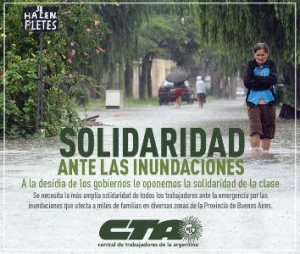La CTA Autónoma de la provincia de Buenos Aires informa que se reciben donaciones de toda clase de artículos para los damnificados de las inundaciones que afectan a más de 100 mil personas de unos 40 distritos.