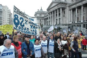 Nosotros presentamos un proyecto de ley que lo venimos presentando y lo volvemos a presentar sobre las jubilaciones, pero el gobierno nos presenta otro proyecto de ley que dice que le van a pagar a los jubilados todo lo que les deben por tantos años pero ponen cláusulas que nos están engañando porque en realidad primero dijeron que iban a pagar la mitad de lo que deben y el resto en bonos más adelante cada tres años, cuando tenían el dinero para pagarlo. Entonces nos volvemos a sentir engañados y burlados porque no es como se había prometido, incluso en la campaña del actual presidente, que dijo que iba a darle el 82% a los jubilados, que iba a considerar nuestra situación y ahora nos encontramos con que la cosa no es tal y ahora nosotros, los que todavía podemos, seguimos protestando y pidiendo que no nos engañen más y que de una vez por todas cumplan con la deuda que tienen con nosotros.