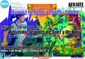 El día lunes 5 de mayo a las 16 horas, en la sede de la Asociación de Empleados Judiciales de la Ciudad de Buenos Aires (AEJBA-FJA), tendrá lugar una actividad en ocasión del día de los trabajadores y trabajadoras, conmemorado el 1º de mayo, con una muestra de fotos y charla-debate: «Reivindicaciones de ayer y de hoy».