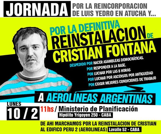 El lunes 10 de febrero, a las 11 horas se hará una marcha por la reinstalación de Cristian Fontana y de Luis Yedro. La cita es a partir de las 11 hs. frente al Ministerio de Economía (Hipólito Yrigoyen y Defensa, CABA). Luis Yedro, despedido de Atucha II y Cristian Fontana, despedido de Aerolíneas. Ambos con fallos de reinstalación que se niegan a cumplir los funcionarios gubernamentales, que persiguen a los luchadores.