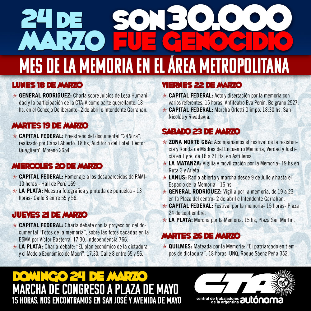 Durante todo el mes de marzo, en las diferentes regionales del Área Metropolitana de la CTA Autónoma se estarán realizando actividades en torno a la Memoria, la Verdad y la Justicia. El 24 de Marzo se movilizará como cada año en las principales ciudades del país. En Capital Federal, la marcha es de Congreso a Plaza de Mayo (Nos encontramos en San José y Avenida de Mayo, a las 15).