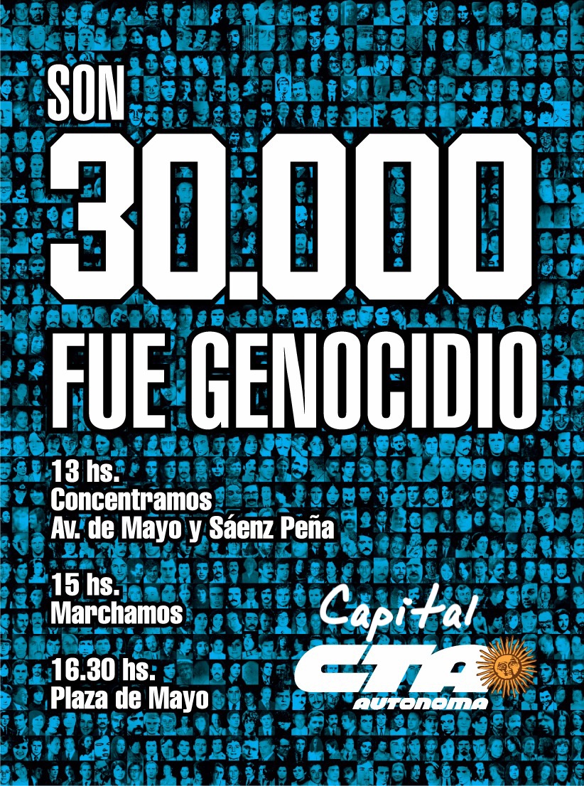 “Esta marcha, además de para pedir como todos los años Memoria, Verdad y Justicia, es para refrendar que fueron 30 mil los compañeros detenidos-desaparecidos; que fue un genocidio, y que es para que reafirmar lo que venimos diciendo desde hace 41 años, que no nos reconciliamos. Ya el Gobierno anterior miró en una etapa a ver si podía meter la reconciliación, por suerte en ese momento todos reaccionamos a tiempo y no fue posible, así que a este Gobierno hay que hacérselo saber también, claramente llenando la Plaza de Mayo”, afirmó Margarita Noia, secretaria de Derechos Humanos de la CTA Autónoma de Capital