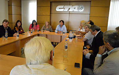 “Nos da mucho gusto recibirte a vos y a tu grupo de compañeros”, dijo Pablo Micheli al saludar la presencia de Margarita Stolbizer y al resto de los legisladores. Estaban con ella Alicia Ciciliani (Partido Socialista), Omar Duclos, Marcelo Ferreiro, Gerardo Milman, Carlos Venac y Mario Ru (GEN). Por su parte, Micheli también presentó a quienes lo acompañaban de la Mesa Nacional de la CTA: José «Pepe» Peralta, Julio Gambina, Horacio Meguira, Jorge Cardelli, Carlos Chile y Rita Liempe. También estuvo presente en la reunión Rubén «Pollo» Sobrero.