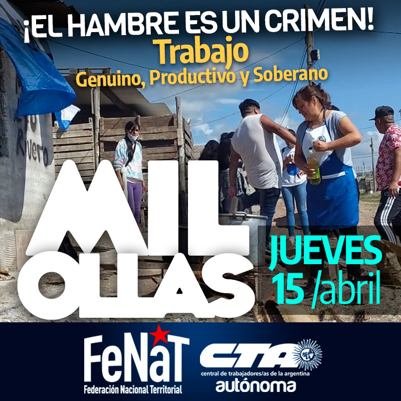 No hay posibilidad de salir de la pandemia sanitaria y social si no hay un Estado que invierta en políticas públicas (trabajo digno y soberano, viviendas, educación para todos y todas). Todos los días nuestros compañeros y compañeras son esa trinchera para resistir al hambre. Desde la Quiaca a Tierra del Fuego podemos construir este número de las mil ollas, que no es algo que lo hacemos para los medios sino que las llevamos adelante todos los días. Nuestros compañeros y compañeras le ponen el pecho al hambre todos los días y no es sólo hambre de comida sino de posibilidades, de abrazos, de futuro y en este sentido las mil ollas representan nuestra capacidad organizativa a nivel nacional.