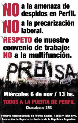 «El Plenario Autoconvocado de Delegados de Prensa Escrita, Radial y Televisiva junto a la Asociación de Reporteros Gráficos de la República Argentina (ARGRA) llaman a una movilización para rechazar las amenazas de despidos en Editorial Perfil y decirle No a la precarización laboral.