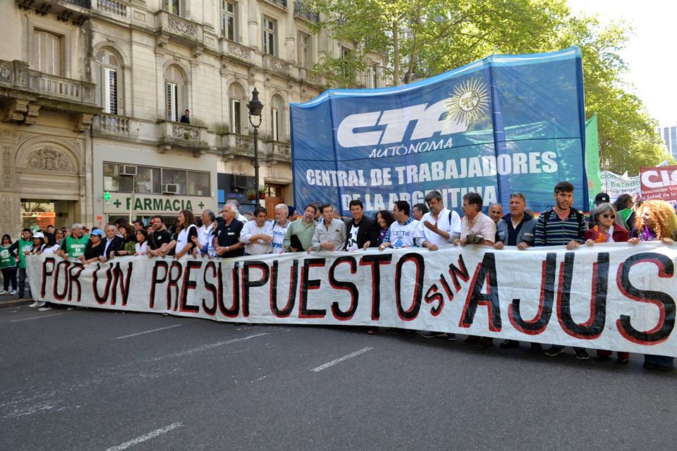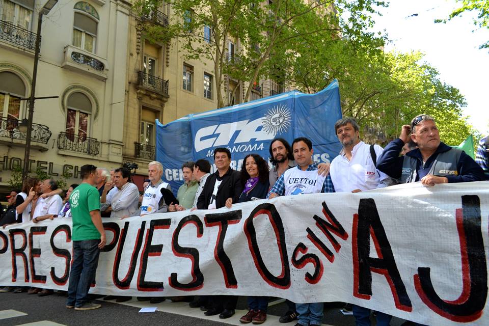 “Hoy nos hacemos presentes para decir que no queremos volver a la Argentina del desempleo, queremos que nuestros compañeros y compañeras vuelvan a los sectores de trabajo de donde han sido injustamente echados, repudiamos los más de 200 mil despidos que en tan solo 9 meses este Gobierno ha llevado adelante. También estamos planteando que se reabran las paritarias, porque entendemos que las cifras que se han fijado de manera arbitraria hoy no alcanzan para llegar a fin de mes, hay una inflación de 45% anual y nosotros cerramos en 31%, que en términos reales es un 27%, y eso no nos alcanza. Por todo esto marchamos hoy; somos miles, todavía la marcha no arrancó y ya es multitudinaria.”, concluyó Pablo Spataro.