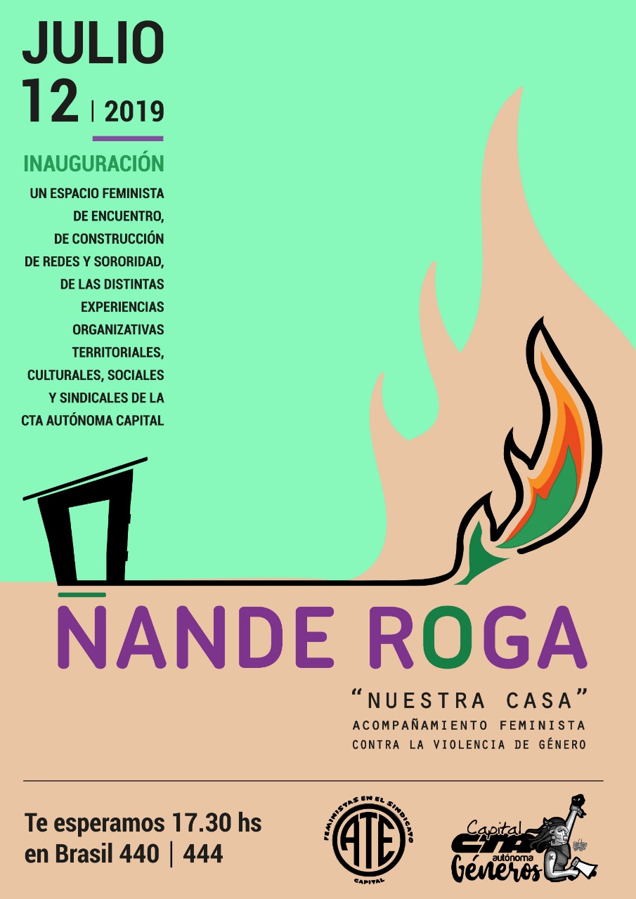 Este viernes 12 de julio a las 17.30 horas en Brasil 440 -pegado a la Casa Cultural Pepa Noia- se inaugurará Ñande Roga, un espacio de acompañamiento feminista contra la violencia de género. Ñande roga es un proyecto de la CTA A Capital impulsado desde las secretarías de Formación y Géneros para poner en marcha un lugar de encuentro, de construcción de redes y sororidad de las distintas experiencias organizativas territoriales, culturales, sociales, sindicales y políticas de la CTAA Capital.