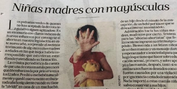 Lo que está haciendo La Nación con esta editorial es claramente apología del delito, intentando romantizar el embarazo forzado de niñas de entre 10 y 15 años. Según datos del Ministerio de Salud, cada 3 horas en Argentina una nena de entre 10 y 15 años entra a una sala de parto. Son un promedio de 8 bebés lxs que nacen por día; 2787 al año.