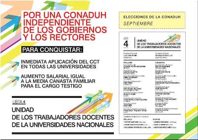 El 9, 10 y 11 de septiembre masifiquemos la Elección y el voto a la Lista N° 4 “Universidad de los Trabajadores/as Docentes de las Universidades Nacionales” para fortalecer la CONADU Histórica».