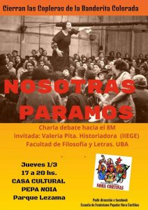 Se acerca el 8 de marzo y el Paro Internacional de mujeres va creciendo, multiplicando sus voces en asambleas de mujeres, lesbianas, travestis y trans.El 8 de marzo nosotras paramos y somos parte de esa marea que no para de crecer. Y en camino hacia ese día, nos encontramos el jueves 1 de marzo para compartir experiencias de lucha y organización de mujeres. Contaremos con la presencia y voz de la historiadora Valeria Pita (UBA). Compartirá su arte con nosotras Luli Adano y el cierre cultural a cargo de las Copleras de la Banderita Colorada.”, explican desde la organización.