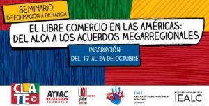 En el marco de la Asamblea Argentina Mejor Sin TLC, la Confederación Latinoamericana y del Caribe de Trabajadores Estatales (CLATE), junto a la Union Network International de las Américas (UNI), la Asociación por una Tasa a las Transacciones Financieras y por la Acción Ciudadana de Argentina (ATTAC), el Instituto Mundo del Trabajo de la Universidad de Tres de Febrero (IMT-Untref) y el Instituto de Estudios de América Latina y el Caribe de la Facultad de Ciencias Sociales de la Universidad de Buenos Aires (IEALC-FSOC/UBA), invitan a participar del Seminario de Formación a Distancia: “El libre comercio en las Américas, del ALCA a los Acuerdos Megarregionales”.