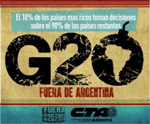 En este contexto, representantes de organizaciones sindicales, sociales y políticas se reunieron en la Facultad de Ciencias Sociales de la UBA, en agosto pasado, para organizar la resistencia a la Cumbre del G-20. Fueron más de 200 representantes de organizaciones del país y de la región: la CTA Autónoma, ATTAC Argentina, Jubileo Sur, ATE, Frente Darío Santillán, Movimiento Evita, CTEP, Libres del Sur, PSTU, Movimiento Campesino de Misiones, Frente de Organizaciones en Lucha (FOL), Red Amigos de la Tierra, Asamblea Argentina Mejor Sin TLC, Multisectorial Anti-Extractivista, Sociedad de Economía Crítica y CLATE, entre otros.