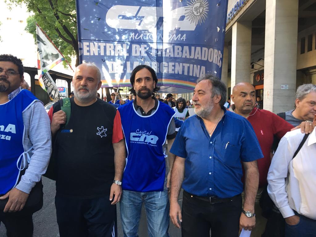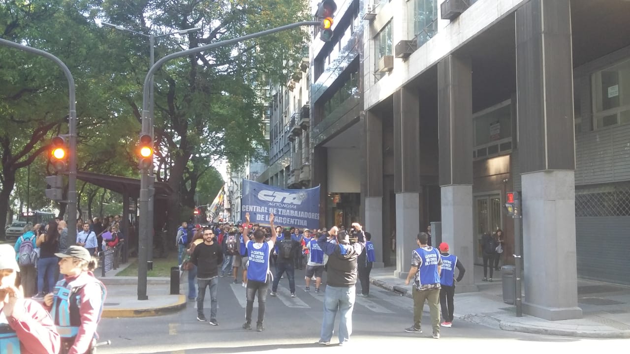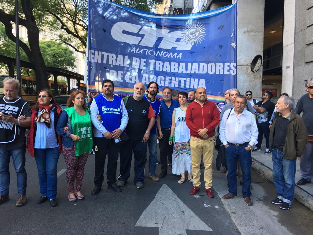Compañeras y compañeros de Telefónicos-CTA, del Sindicato de Trabajadores de Maestranza y Mantenimiento (SITMMA-CTA), del Sindicato de Trabajadores de Entidades Bancarias y Financieras (SITEBA-CTA), del Sindicato de la Salud -CTA, del Sindicato de Psicólogas y Psicólogos de la República Argentina (SIPPSIRA), de la Organización Sindical de Trabajadores de la Vigilancia (OSTV-CTA), del Sindicato de Trabajadores de la Obra Social Docente (SITOSPLAD-CTA) y de la Unión de Conductores de la República Argentina (UCRA CTA), se movilizaron junto a la Central porteña a partir de las 17 horas desde Avenida Corrientes y Além hasta la sede del ex Ministerio de Trabajo.